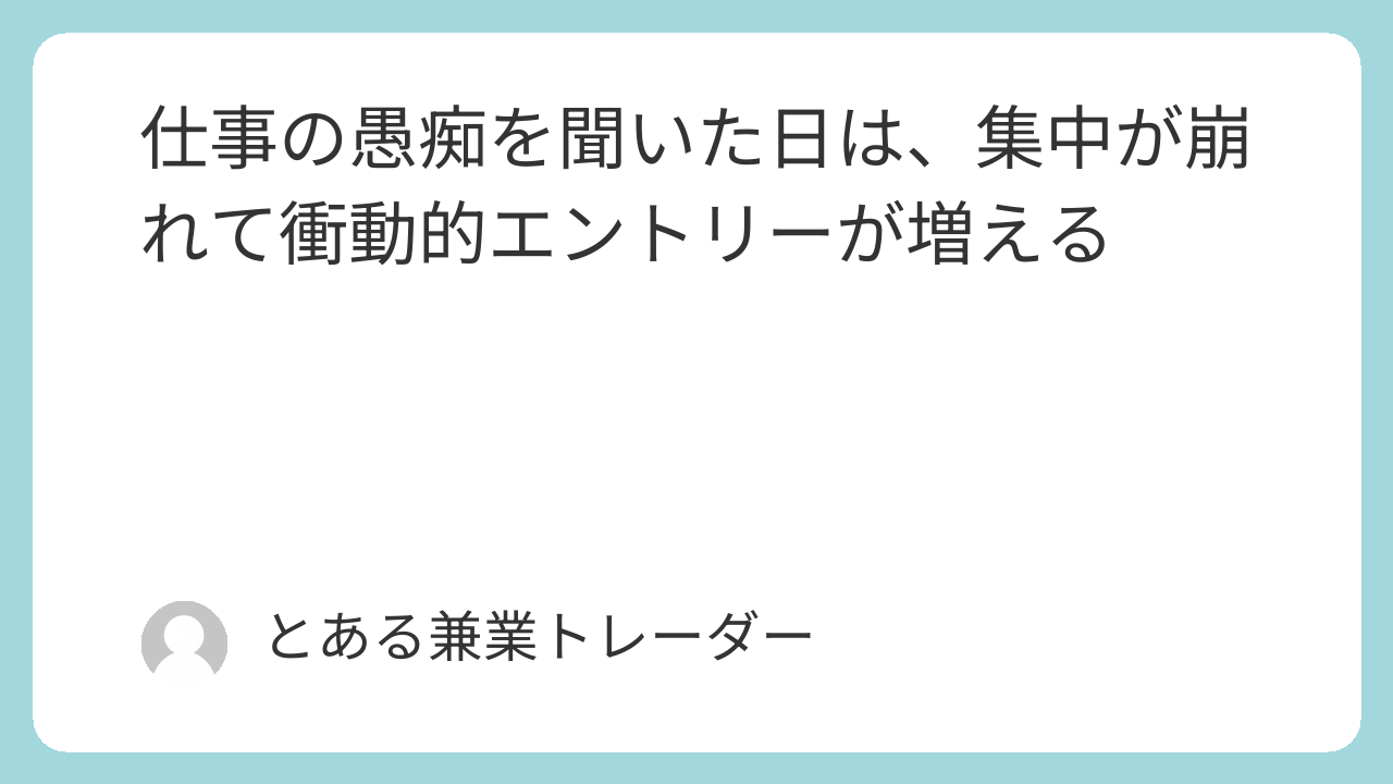 兼業トレードでは、「集中力は、他人のネガティブ感情で乱される」という前提を意識して行動することが、結果的に安定につながると感じています。